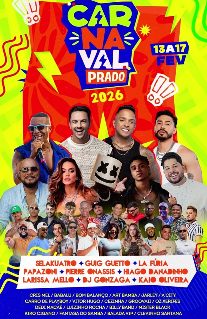 O carnaval de Prado terá SelaKuatro, Papazoni, Lá Fúria, Guig Ghetto, Hiago Danadinho, Pierre Onassis, Larissa Mello, DJ Gonzaga e muitos mais em cinco dias de festa.