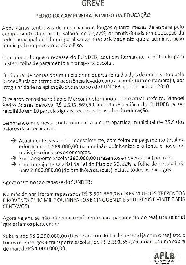 Entretanto, no folheto, os sindicalistas colocaram assim: “O Tribunal de Contas dos Municípios, na quarta-feira dia dois de maio, votou pela procedência do termo de ocorrência lavrado contra a Prefeitura de Itamaraju por irregularidade na aplicação dos recursos do FUNDEB, no exercício de 2010. O relator, Conselheiro Paolo Marconi, determinou que o atual prefeito Manoel Pedro Soares devolva R$ 1.212.569,59 à conta específica do FUNDEB, a ser recolhido em 10 parcelas iguais, recursos desviados da Educação”. Não precisa ser muito inteligente para entender que o panfleto com o texto manipulado foi, na verdade, uma jogada política para tentar desmoralizar o gestor.